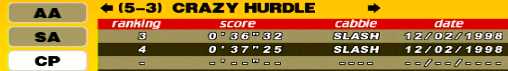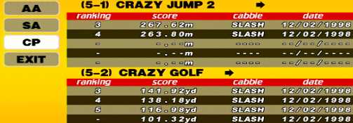 For Crazy Taxi 2, it looks like we got a little bit more going on this time. We actually got scores for Around Apple and Small Apple, as well as Crazy Pyramid. In Crazy Pyramid I guess they couldn't figure out 4-2 and 5-4 so they skipped them. I get the vibe that whoever owned this VMU liked Crazy Taxi 2 the most.