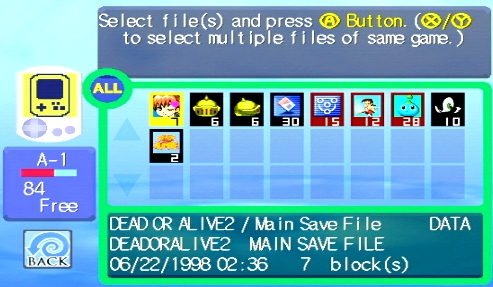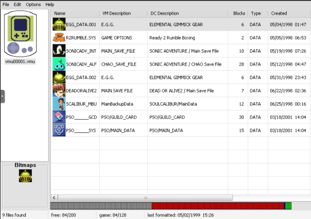 October 17th, 2025 - VMU #3 by CMA THE DOPE MAN You are currently on: PAGE 1 Page 1 | Page 2 | Page 3 | Page 4 | Page 5 | Page 6 First, a word from the dope man... Before I get started, I just wanna send a mega dope shoutout to the folks over at the Ragol.org Discord server for the kind words they had about this website. Ragol.org site & Discord admin Matt was kind enough to let me post the website in his Discord server, and just from watching the logs in real time there were quite a few people checking out the site. I hope y'all bookmarked it! Also, one last thing, if you are reading this on a real Sega Dreamcast with an OEM VMU plugged in, go ahead and take a look at your VMU screen. That's right, I've added a text scroller! Shout out to the homie Blst from the Ragol.org Discord for giving me the idea to add this. And now, back to our regularly scheduled programming... Alright, today we got another 3rd party VMU special. Another 4x VMU! This one is a Pelican 4x VMU with a clear smoke grey shell. I think this same model was sold under a few different brands (this seems to be common among 3rd party Dreamcast VMUs). There is a button on the left-hand side of the VMU that allows you to select one of the four banks. I bought this particular VMU from a gentleman on eBay back in January 2025, I do not remember which state this one came from. I should note that in today's post that even though this is a 4x VMU, that only the first bank was used. The remaining three banks were blank when I received it (this is somewhat of a common thing I have seen with these 3rd party 4x VMUs). This particular model actually has a connector on the top of it. There is a parallel port cable that you can plug into this connector which will plug into a PC which allows you to save/dump VMU saves the old school way. I believe the software that works with it was designed for Windows 95/98. I do not have this special parallel port cable, but really nowadays you don't need it as there are more modern (and honestly way better) ways of doing the VMU backups/dumps. BBA + DreamExplorer + DCLOAD-IP + VMU Explorer is what I use to do this. Here is what it looks like plugged into my smoke OEM grey controller. It even lights up! There is also a button on the left-hand side of the VMU for switching the memory banks. The red and green LED color combinations change depending on which bank is currently selected. I'm using my standard Dreamcast test setup. This consists of a Sega Dreamcast Sports console with a GDEMU w/ 512GB SD Card + DreamPSU + BBA. All VMUs I test get backed up, with both full VMU dumps + individual save dumps. The full VMU dump then gets loaded onto a 'COPY VMU' which is basically a throw-away VMU I can restore VMU dumps to so that the original VMUs don't get accidentally altered/deleted/overwritten/corrupt/whatever. The save files you see are original to what I found. Alright, time to dig in! --- BANK 1 --- Here's a screenshot of the saves straight from my Sega Dreamcast: Here's the full metadata from VMU Explorer: Here's what we got: - Elemental Gimmick Gear (E.G.G.) - Ready 2 Rumble Boxing - Sonic Adventure Main Data + Chao Data - Dead or Alive 2 - Soul Calibur - Phantasy Star Online Main Data + Guild Card (!!!) OK so we got an interesting selection here. I'm very curious to check out the Sonic Adventure chao data. I had to look up what Elemental Gimmick Gear was, turns out it's sorta like an action RPG. And of course, we got a PSO character to restore. Hopefully this is another one we can add to our restored PSO character list! The rest of the games listed are usual suspects. The only date stamp on any of the saves that looks even half-way legit is the 3/18/2001 2:04PM date code on the PSO saves. As usual you really have to take these time stamps with a grain (or an entire shaker) of salt, as the Dreamcast battery dies very quickly and often people don't put the current time back in when prompted on startup. The 1998 time stamps you see listed in VMU Explorer are a perfect example of that. It would be fair to say based on the PSO save date that this VMU hasn't been touched, at the latest, since 2001 (24 years ago as of me writing this). Anyway, see ya on the next page.